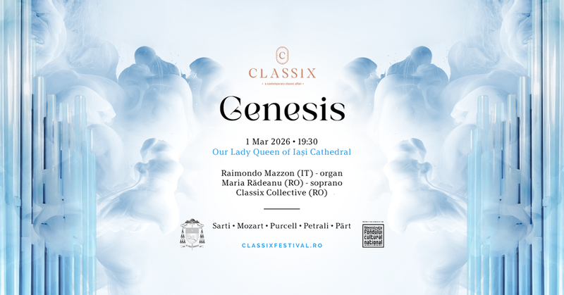 Genesis propune un parcurs preclasic și romantic, în care recitalul organistului italian Raimondo Mazzon este completat de Classix Collective și de vocea sopranei Maria Rădeanu, traversând sonate da chiesa, muzică de cult italiană și meditații sonore contemporane. Concertul va deschide festivalul ca un gest de ascultare, de început și de reîntoarcere la esență.