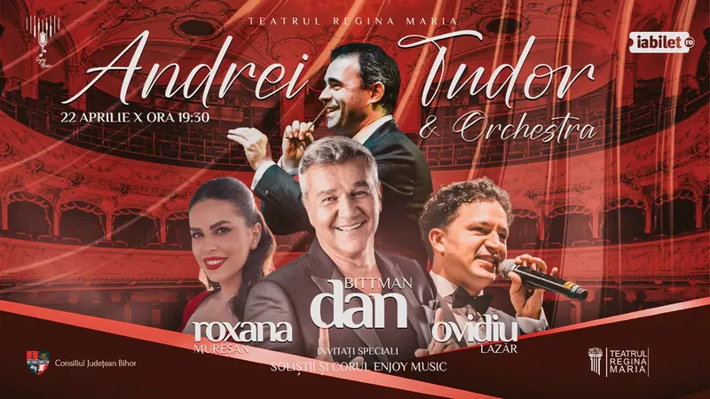 Pe 22 aprilie 2026, de la ora 19:30, Teatrul de Stat Regina Maria din Oradea va găzdui evenimentul „Andrei Tudor & Orchestra”, un concert pop-simfonic grandios dedicat șlagărelor și celor mai frumoase piese de dragoste.