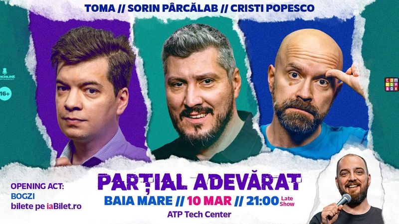 Îi știi de la televizor, de pe YouTube sau de la ComedyBox. I-ai văzut în Una Scurtă, Râzi că Prostu’ sau te-ai uitat la podcastul Ceva Mărunt, iar acum poți să-i vezi LIVE! Sorin Pârcălab, Cristi Popesco și Toma pleacă toamna asta în turneu cu material nou, glume noi și povești care te vor face să râzi în hohote! Hai să-i vezi și tu în cel mai nou show al lor: Parțial Adevărat! Locurile sunt limitate, așa că ia-ți biletele din timp și asigură-ți locul la cel mai așteptat show de Stand-up Comedy al toamnei!