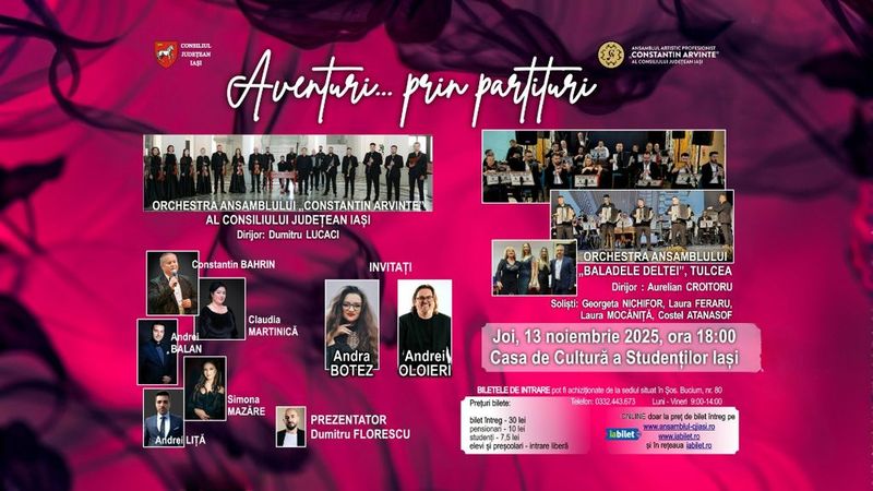 În viața fiecărei instituții există momente în care se simte nevoia unei diversificări, a unor prefaceri repertoriale. În acest spirit, puțin neconvențional, a fost conceput spectacolul „Aventuri… cu partituri”, un eveniment muzical special în care surprizele și momentele inedite vor fi ingredientele principale ale serii de joi, 13 Brumar.