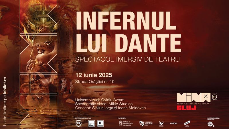 În premieră in Cluj, la MINA, teatrul se transformă într-o experiență totală: sunet, lumină, mișcare și emoție te vor ghida prin fiecare păcat capital. Pășește în cele nouă cercuri ale Iadului, așa cum le-a imaginat Dante în Divina Comedie. Nu ca simplu spectator, ci ca martor prins în mijlocul acțiunii.