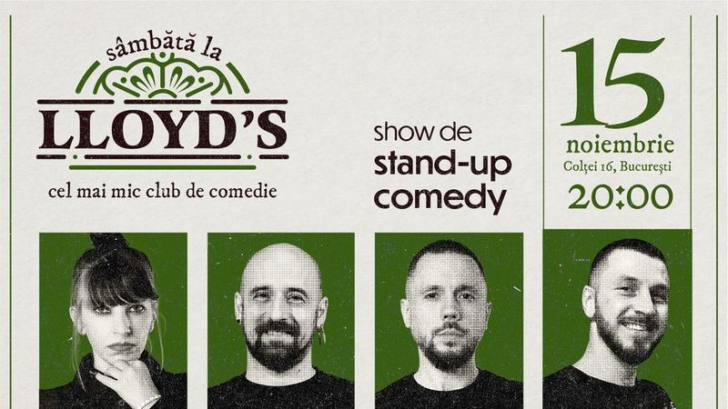 Sâmbătă, 15 noiembrie, ora 20:00, la Lloyd's Comedy Club dăm startul distracției de weekend alături de 5 comedianți care ne vor binedispune cu un Show de Stand-up Comedy plin de umor și energie